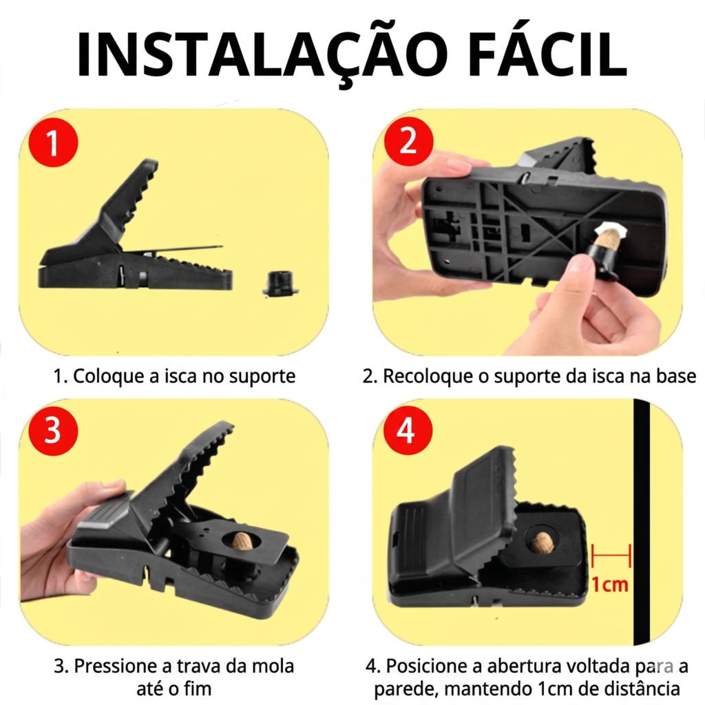 Fácil de armar – Nossas ratoeiras são fáceis de instalar. Coloque iscas aromáticas, como queijo, amendoim e bacon, na estação de isca. Posicione essas ratoeiras perto de rodapés, cantos ou em espaços estreitos. Assim que o roedor acionar a ratoeira, a mola de aço inoxidável de alta precisão o manterá no lugar, garantindo uma morte limpa e sem sujeira, todas as vezes.