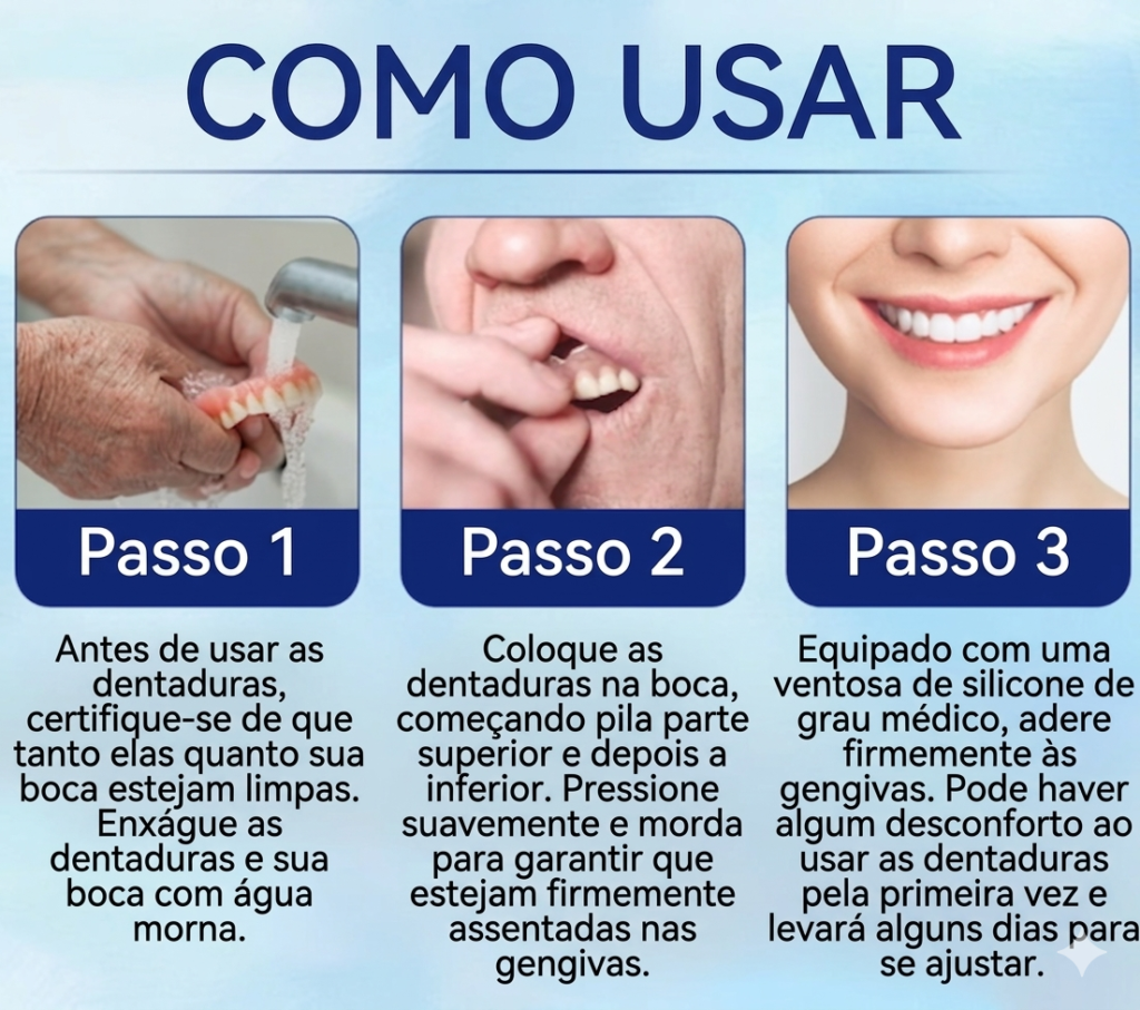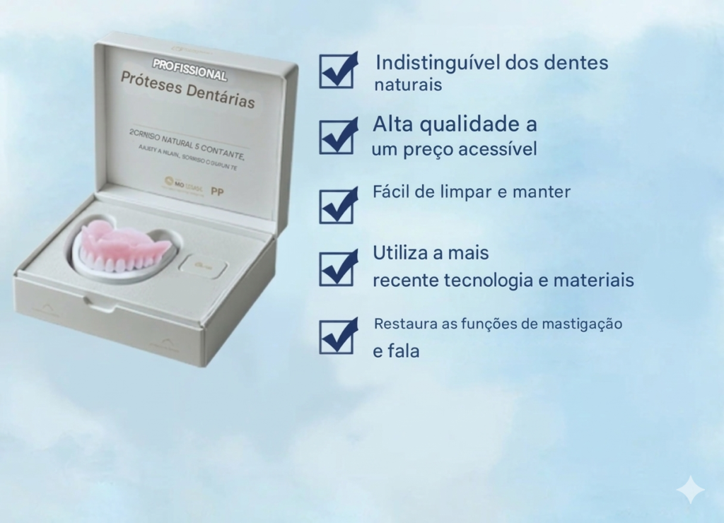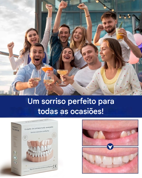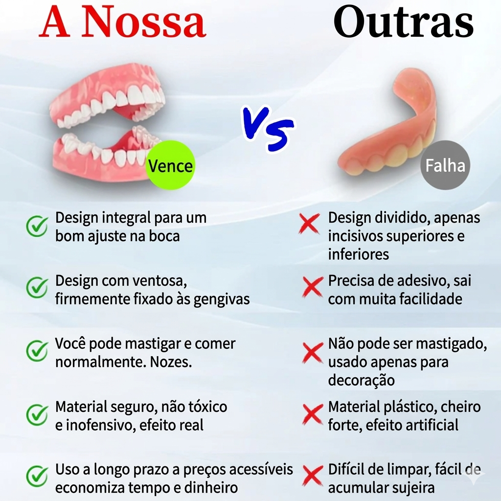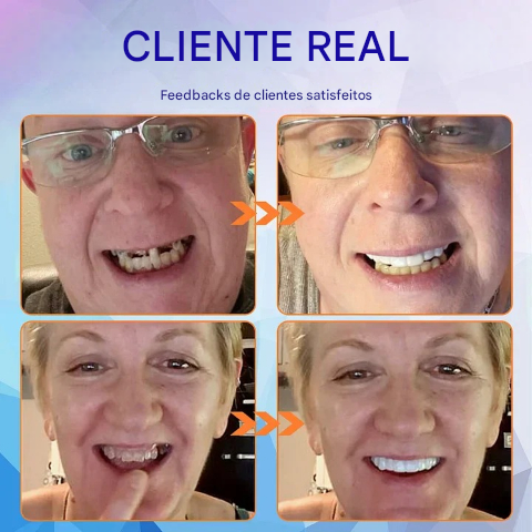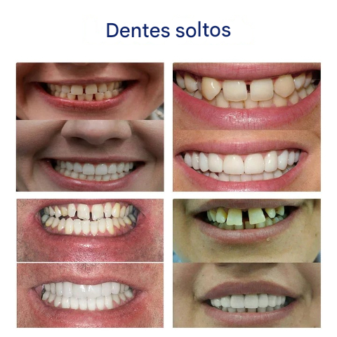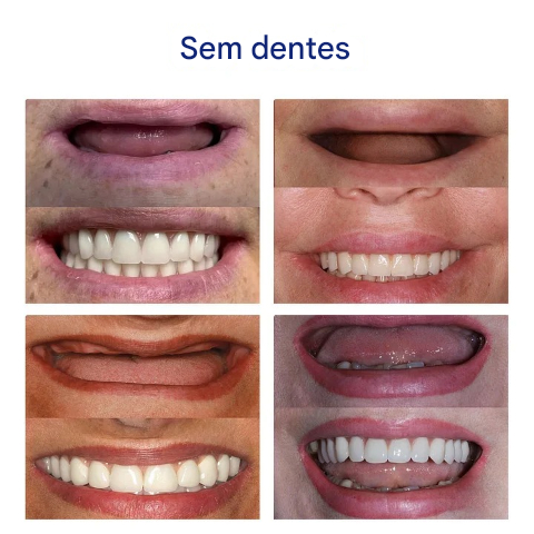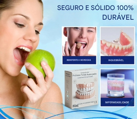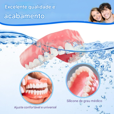 Fácil encaixe. Conforto perfeito: Desfrute de próteses que se adaptam perfeitamente à sua boca desde o primeiro momento. Nosso design inovador garante um encaixe firme e seguro, proporcionando um conforto excepcional que parece uma extensão natural da sua boca. Você pode seguir com o seu dia com confiança, sem desconforto ou deslocamento, permitindo que você coma, fale e sorria sem qualquer incômodo ou preocupação.